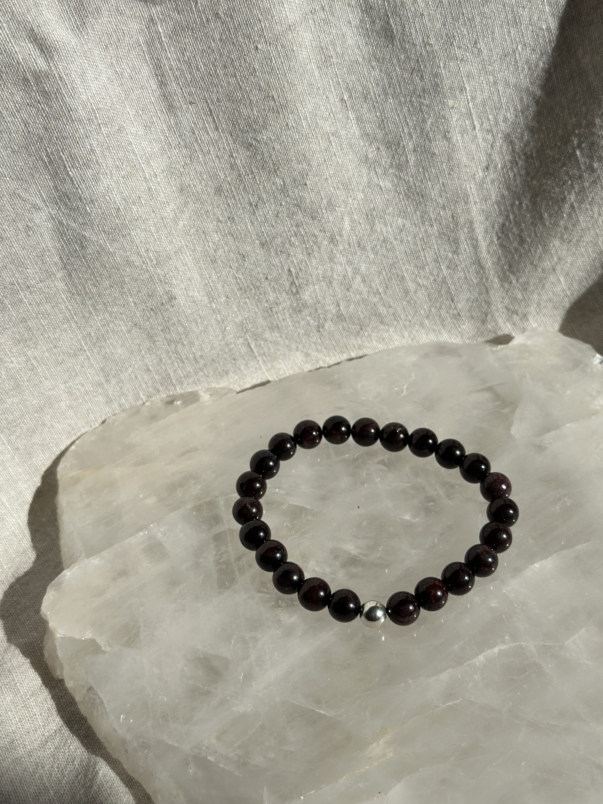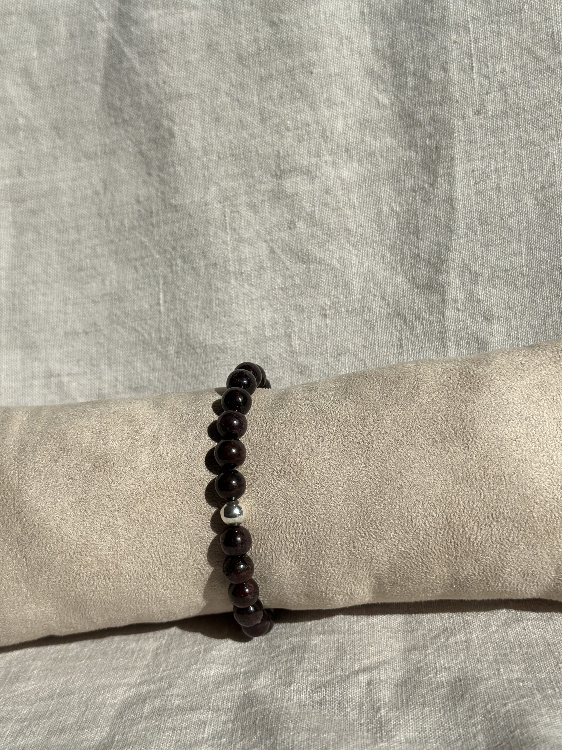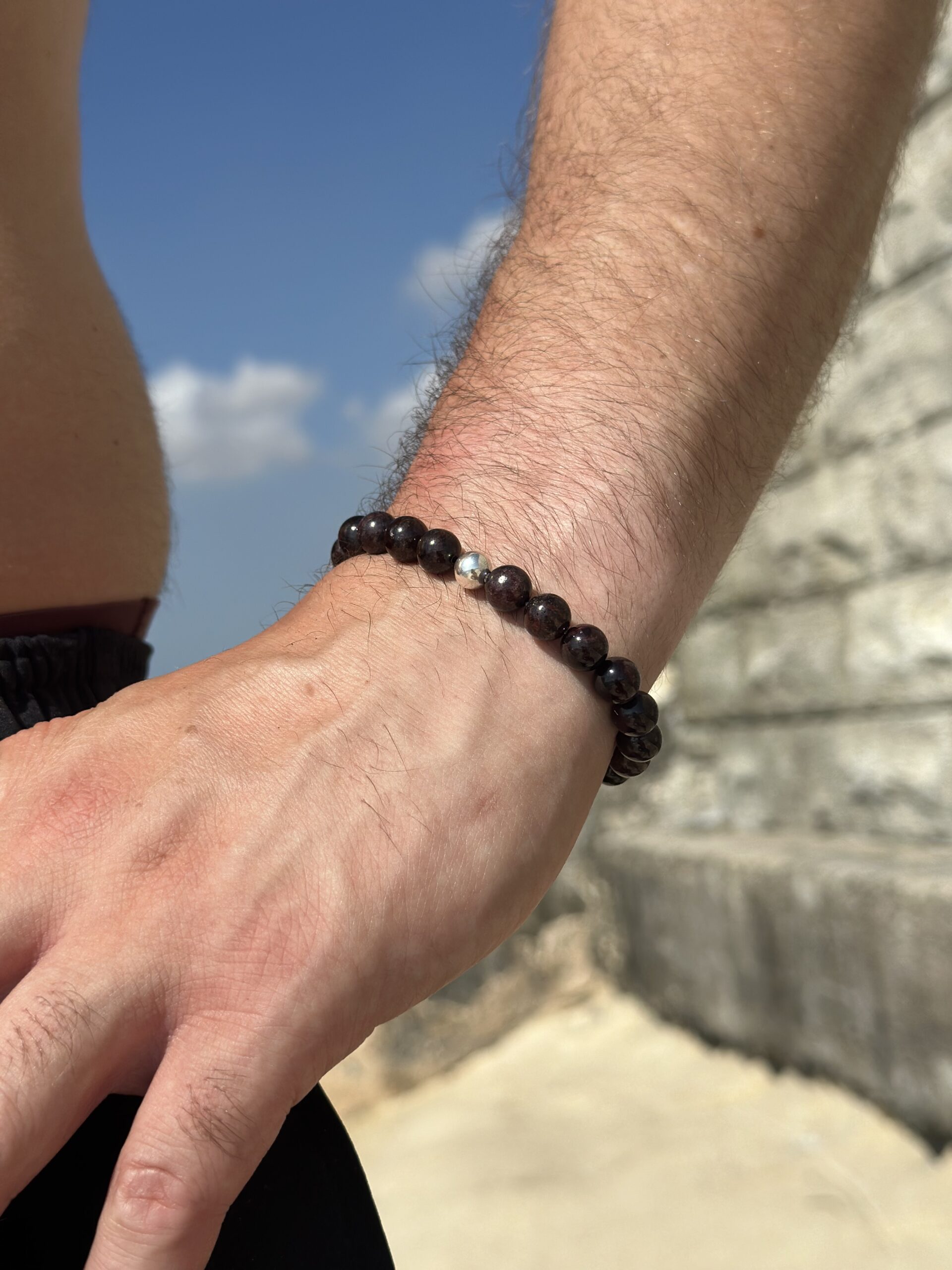 This handmade bracelet combines rugged granite beads with a single polished sterling silver bead. The contrast between the natural texture of the granite and the sleek silver creates a unique and stylish accessory. Carefully crafted, this bracelet adds a touch of refined elegance to any outfit, making it a standout addition to your jewelry collection.
